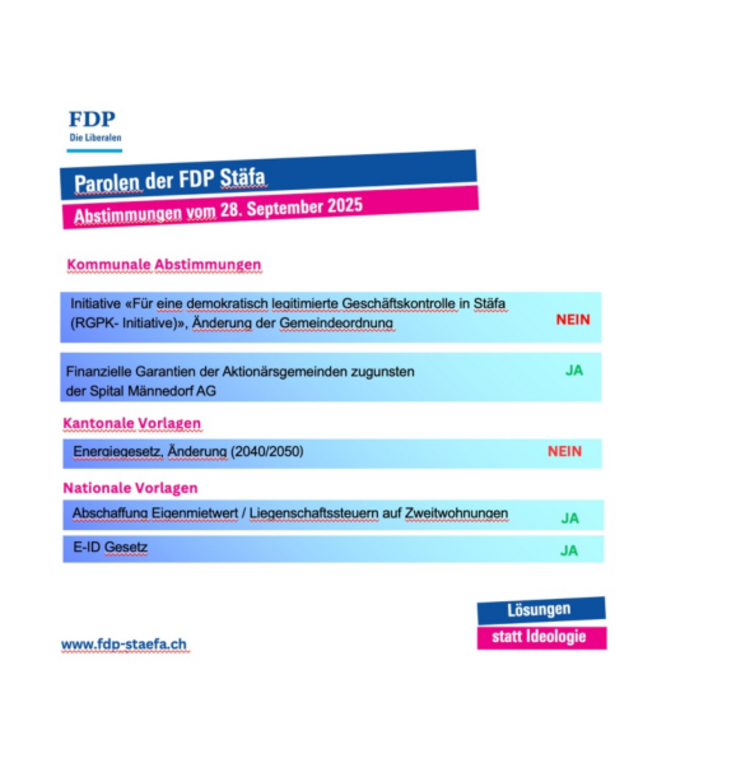 Am 28. September 2025 finden Abstimmungen auf Gemeinde-, Kantons- und nationaler Ebene statt. Die FDP Stäfa stellt dazu eine kompakte Übersicht mit den wichtigsten Informationen und Positionen bereit.