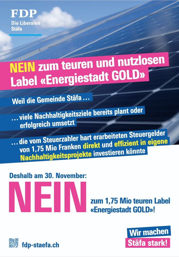 Die FDP Stäfa schliesst sich den Argumenten der RPK an und sagt aus nachfolgend aufgeführten Gründen, NEIN zum Energiestadt Gold Label: