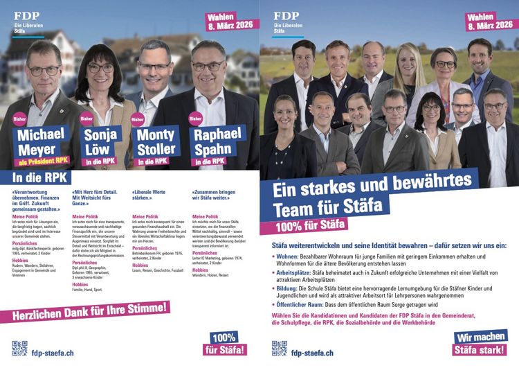 Die Wahlunterlagen für den 8.3.26 sind da! Füllen Sie Ihre Wahlunterlagen aus und unterstützen Sie unsere engagierten FDP-Kandidierenden. Jede Stimme zählt – für Verantwortung, Vernunft und eine zukunftsgerichtete Politik. Herzlichen Dank für Ihre Unterstützung!